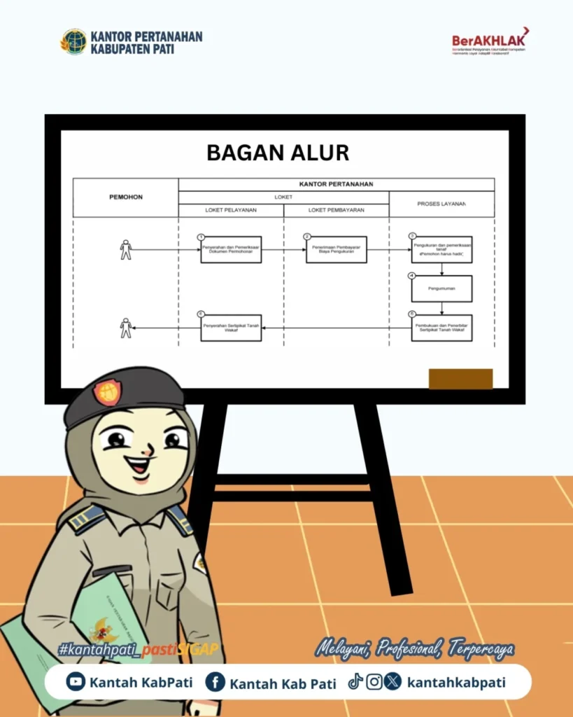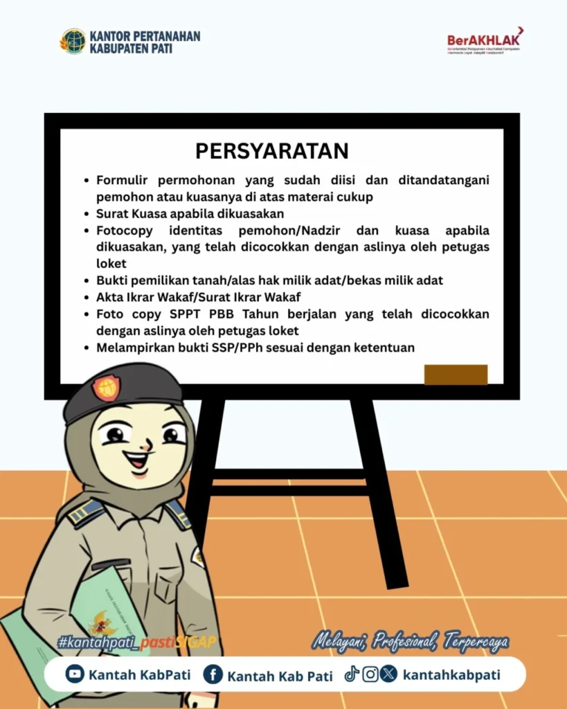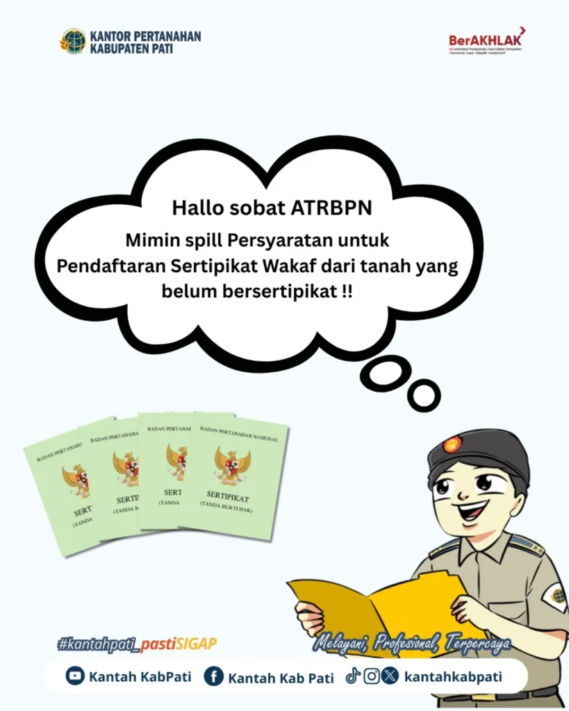 Kantor Pertanahan Kabupaten Pati membeberkan secara rinci dokumen yang harus disiapkan oleh masyarakat yang ingin mendaftarkan tanah wakaf. Informasi ini disampaikan melalui media sosial dan poster edukatif yang menampilkan karakter visual khas Kantor Pertanahan Kabupaten Pati.